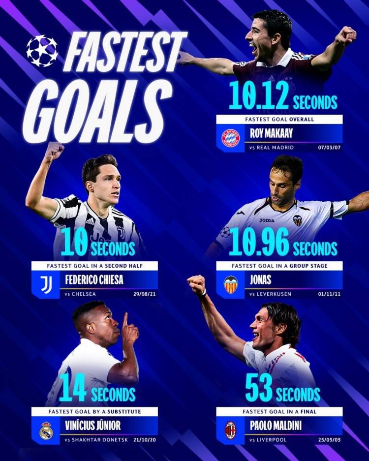 欧冠5大最快进球纪录:替补维尼修斯10.12秒,决赛马尔蒂尼53秒